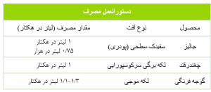 - حداکثر در یک دوره کشت ۲ نوبت محلولپاشی، با مشاهده اولین علایم بیماری و قبل از بروز بیماری و رشد قارچ ها محلولپاشی فاصله ۱۰-۵ روز انجام شود و بسته به شدت بیماری تا توقف کامل بیماری تکرار شود.