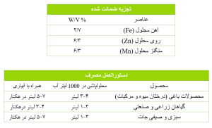 فرمولاسیون ویژه این کود حاوی نسبت های متناسب عناصر آهن، روی و منگنز می باشد که استفاده از آن به طور همزمان و سریع علائم کمبود سه عنصر را برطرف می کند و ضمن افزایش میزان تولید، گیاه در شرایطی مناسب، فصل باردهی را پشت سر می گذارد. مصرف این محصول موجب افزایش میزان فتوسنتز و در نتیجه، بهبود کیفیت و کمیت محصولات کشاورزی و بهبود عملکرد در واحد سطح خواهد شد.